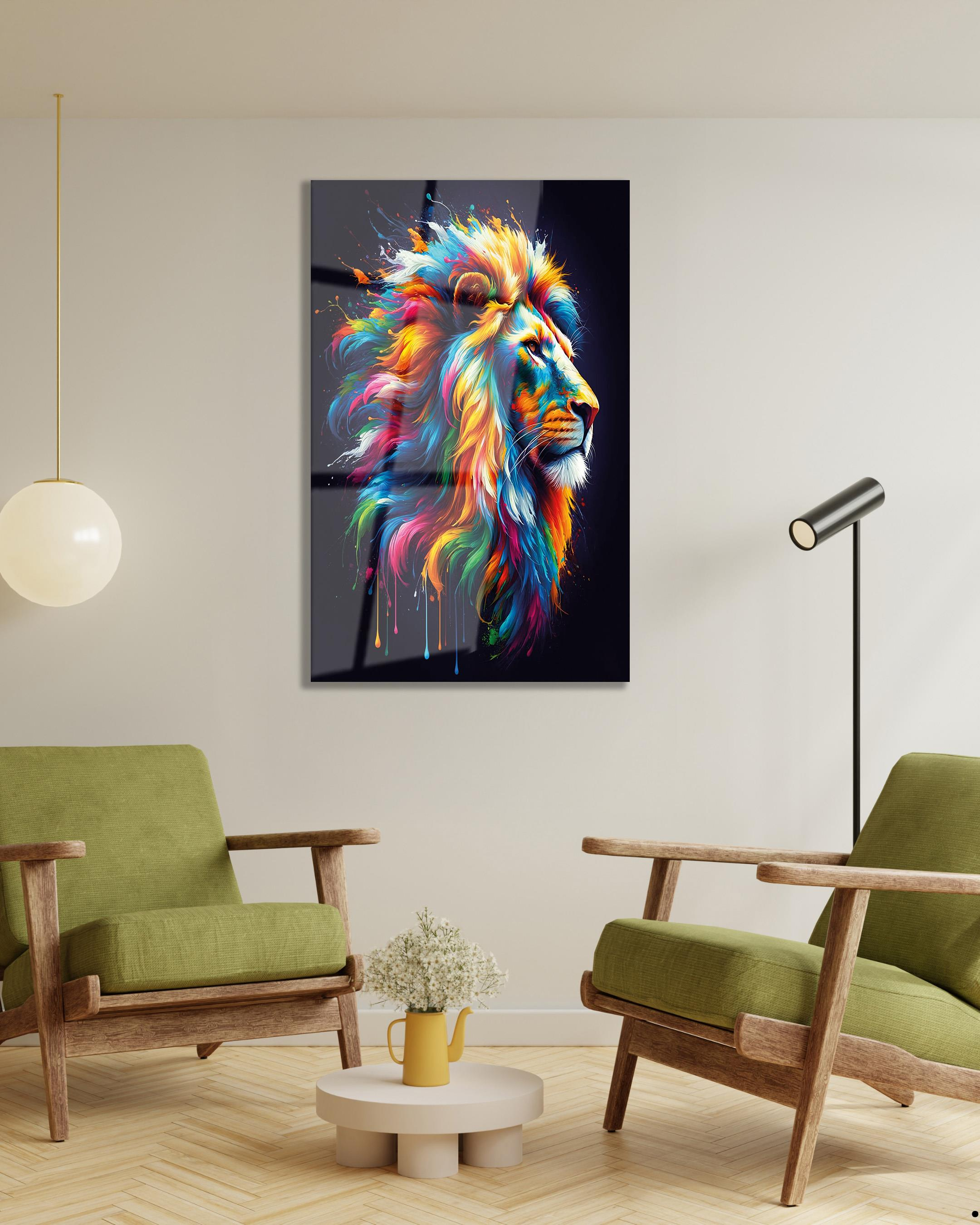 Soyut Aslan Figürlü Renkli  Cam Tablo  Modern Ofis Makam Odası Hediyelik Büyük Tablo Duvar Dekoru
