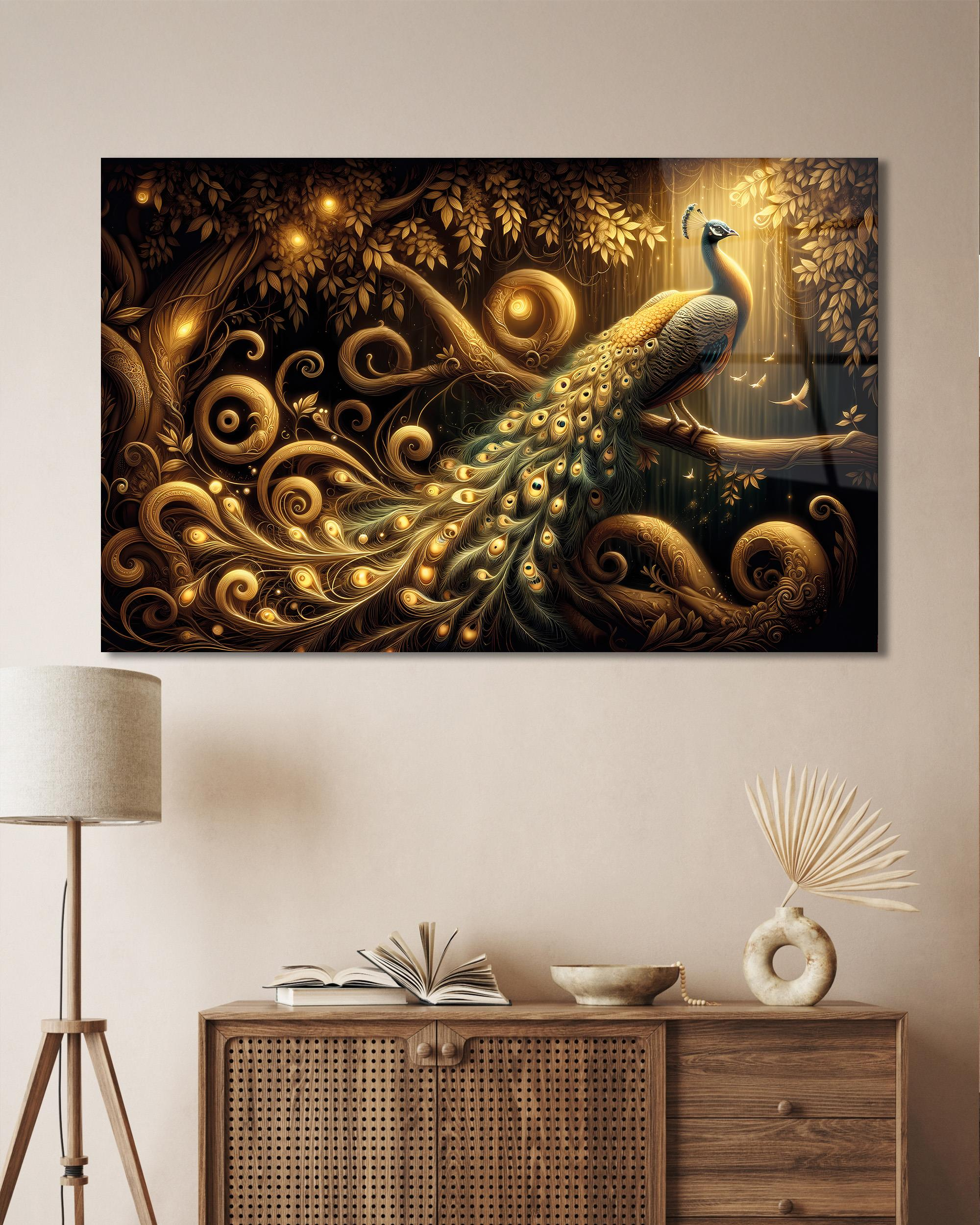 Tavus Kuşu Figür Cam Tablo Modern Ofis Makam Odası Hediyelik Büyük Tablo Duvar Dekoru (GLASSQX20235-3623)